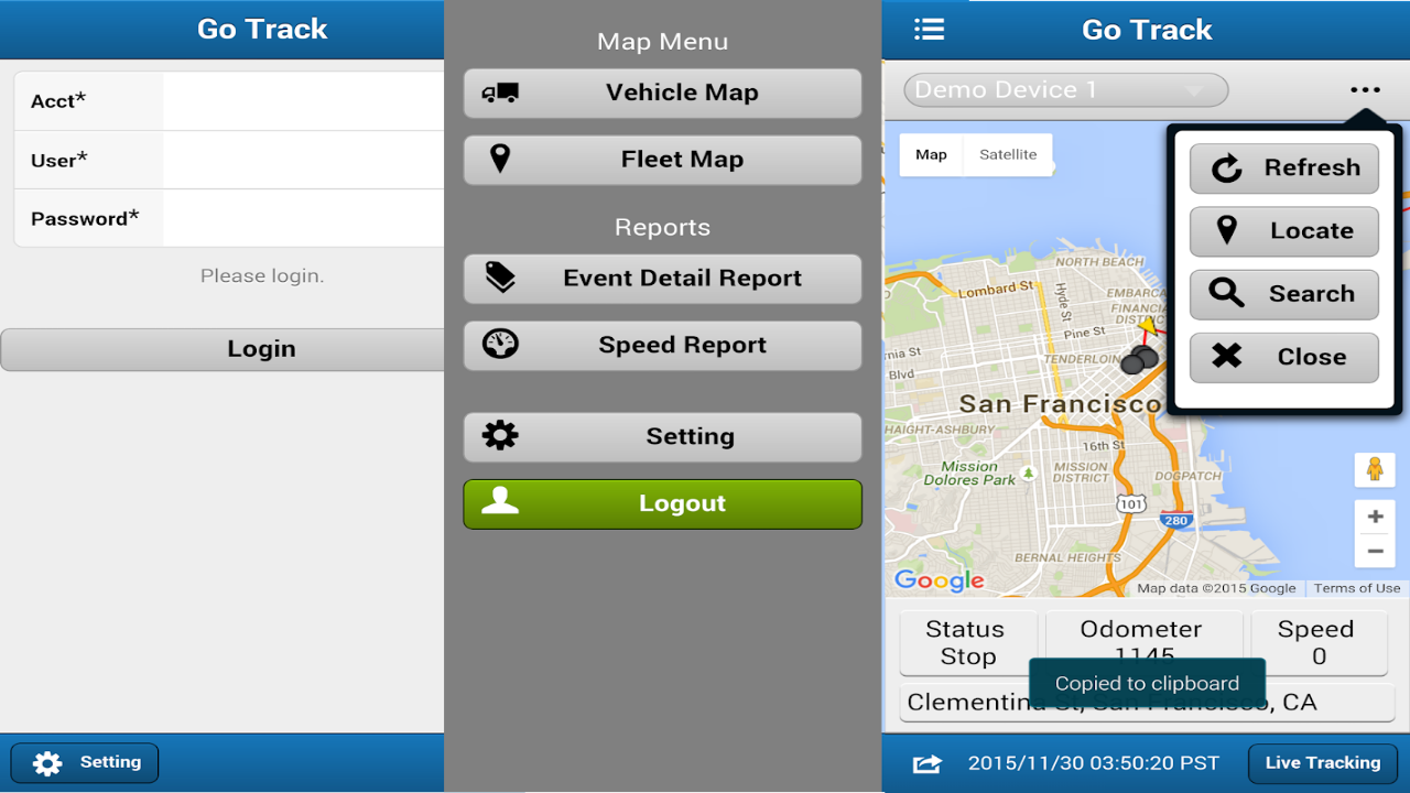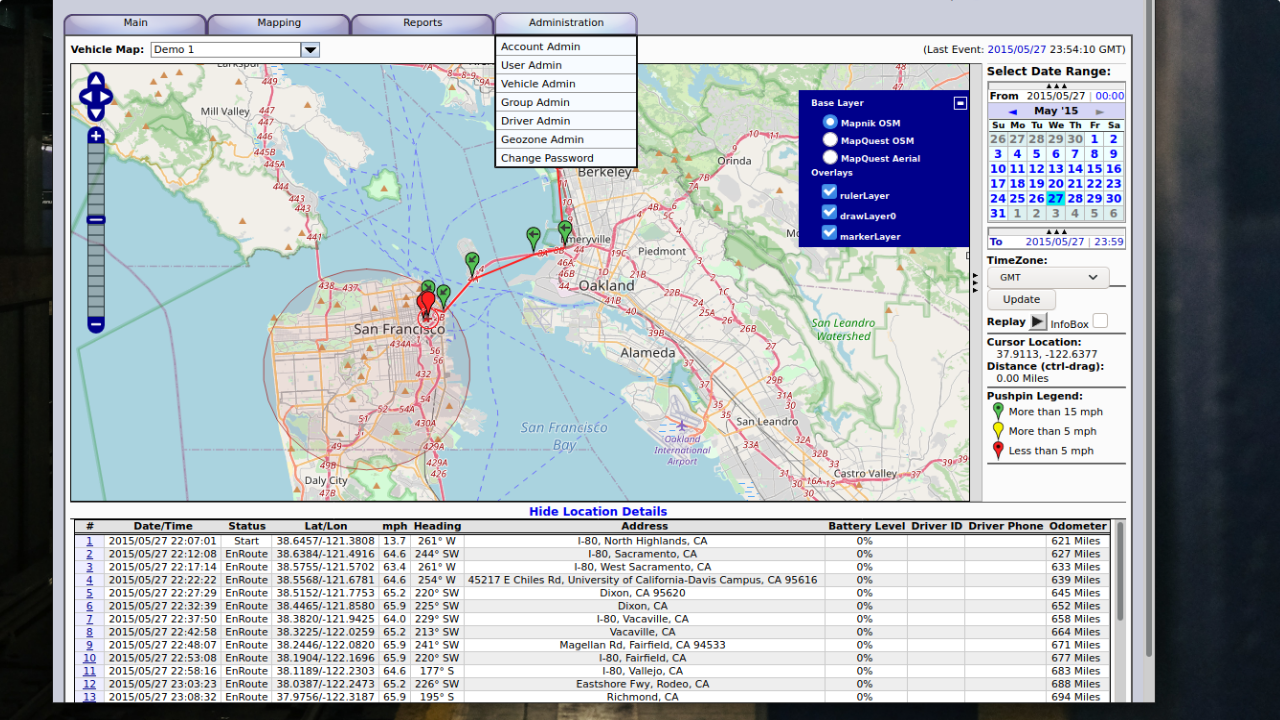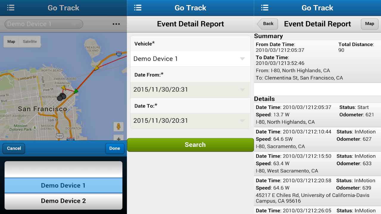 Cuenta con una sección de eventos, donde se registran de manera inmediata las alertas rojas. Con un panel de características de cada usuario o unidad registrada, donde se puede observar su nivel de batería, velocidad, coordenadas, etcétera. Con una barra de reportes para extraer eventos, rutas y resúmenes. Botones y ventanas para añadir/eliminar usuarios, crear grupos, geocercas, contraseñas y “users” para operadores, así como asignar permisos.
